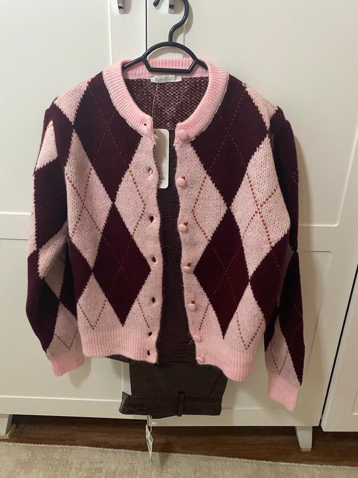 Kadınlar için triko, bol kesim, uzun kollu ve yuvarlak yakalı hırka. Pembe ve bordo baklava desenli, günlük kullanım için uygun rahat stil.