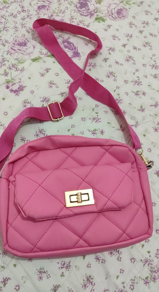 Pembe kapitone dokulu, tokalı kapaklı ve ayarlanabilir askılı omuz çantası, renkli sokak tarzına uygun.