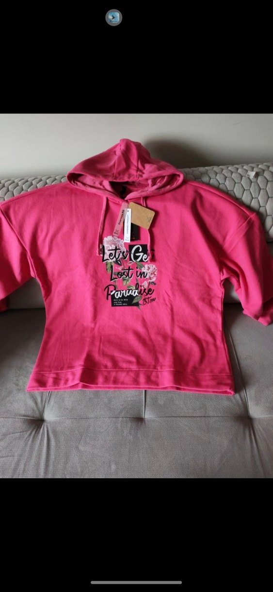 Uzun kollu, kapşonlu , baskılı desenli pembe rahat kesim sweatshirt. Günlük kullanıma uygun yumuşak kumaş ve oversize model