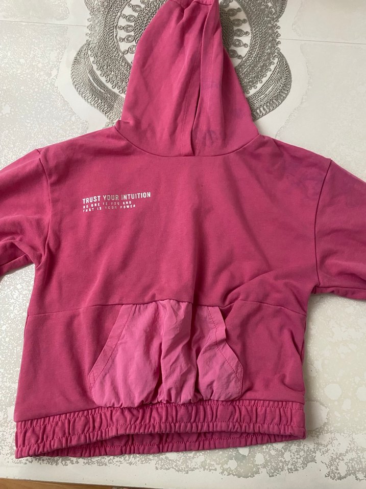 Kadınlar için parlak pembe renkte, kapüşonlu ve uzun kollu bol kesim sweatshirt. Fermuarlı ön cep ve baskılı yazı detayına sahip.