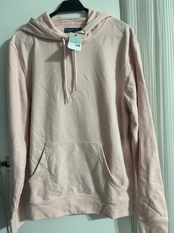 Kadın pembe kapüşonlu, uzun kollu sweatshirt, yumuşak ve sıcak kumaştan, rahat kesim, kanguru cepli ve yuvarlak yakalıdır.