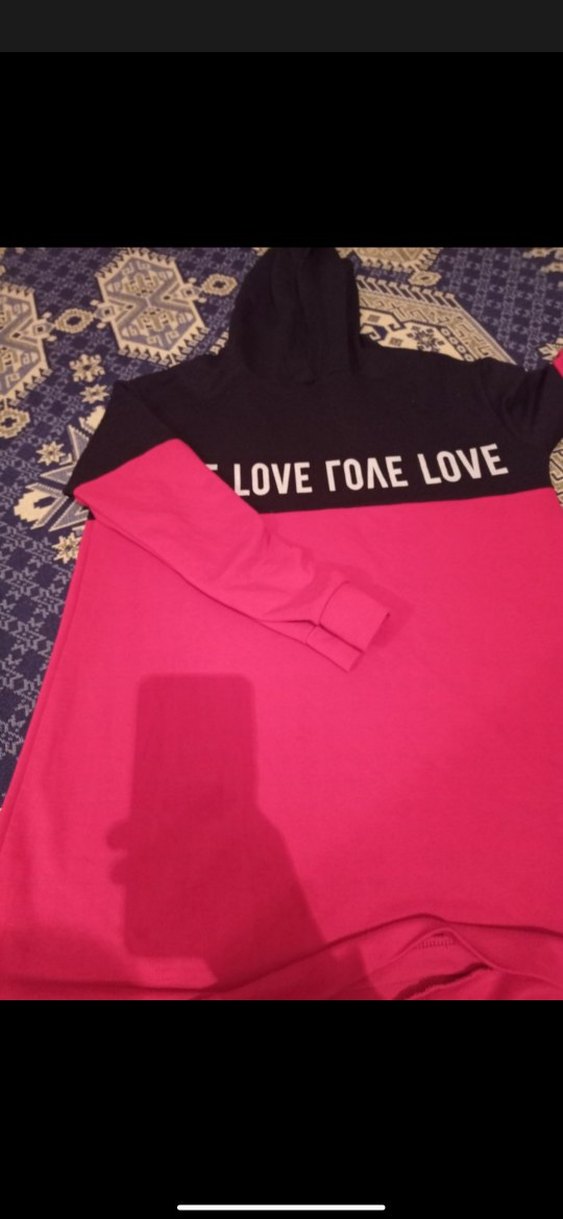 Kadınlar için uzun kollu, bol kesim ve bisiklet yaka detaylı pembe kapüşonlu sweatshirt. Üst kısmı siyah ve göğüste baskılı yazı bulunur. Yumuşak, örme kumaştan, rahat ve sıcak bir sokak stili sunar.