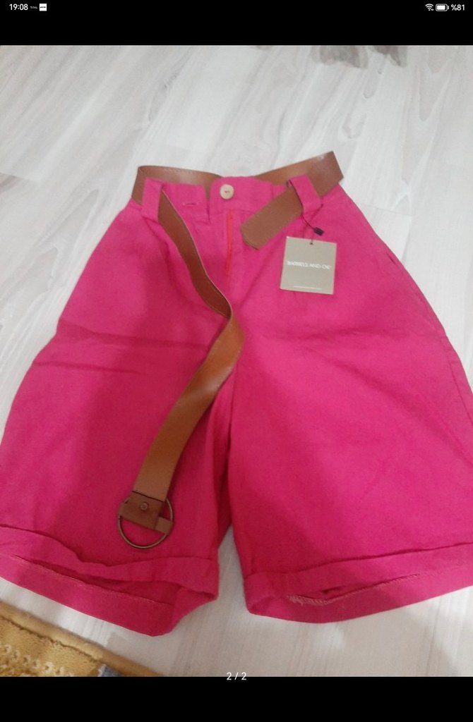 Kadın pembe bermuda şort, pamuklu kumaştan, bol kesim ve kemerli. Günlük kullanıma uygun rahat sokak stili.