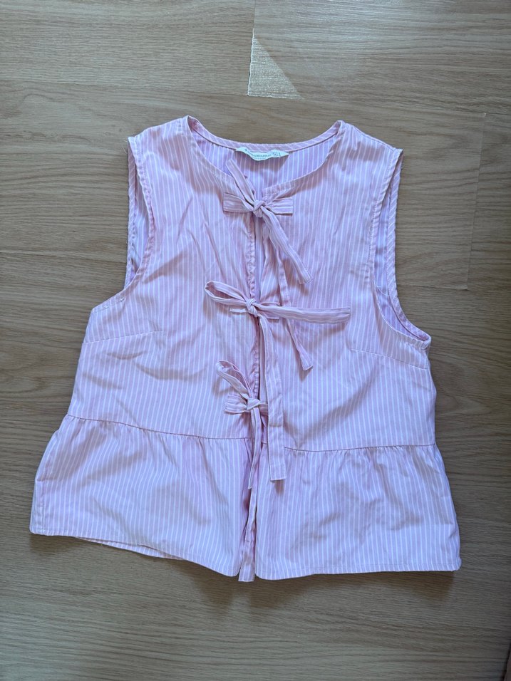 Kadın için kolsuz, V yaka ve düğmeli bağlamalı pembe keten yelek. Rahat kesimli ve ince çizgili, günlük kullanım için uygundur.