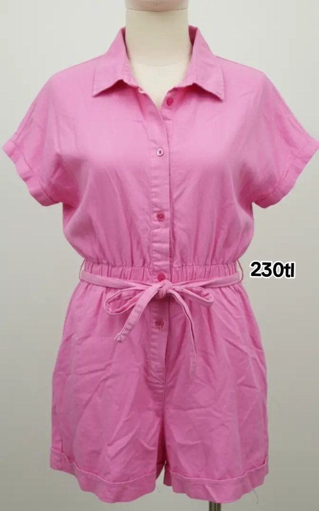 Pembe renkli, keten kumaştan yapılmış kısa kollu, yakalı ve düğmeli ön kısmı olan bol kesim mini tulum. Belden bağlamalı ve günlük kullanıma uygun.