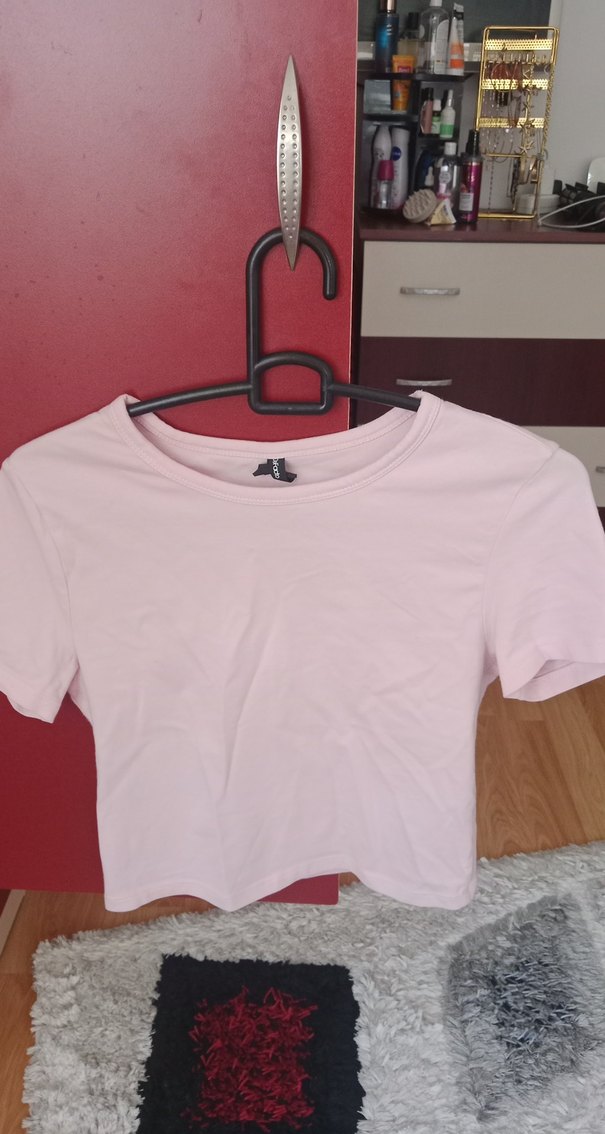 Pamuklu, kısa kollu, düz pembe renkli ve bisiklet yakalı kadin tişörtü. Rahat ve şık bir günlük giyim parçası.