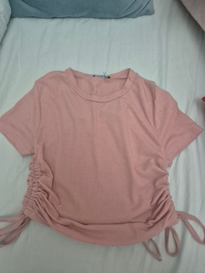 pembe kısa kollu, bisiklet yaka, dar kesim kız tişörtü. S beden