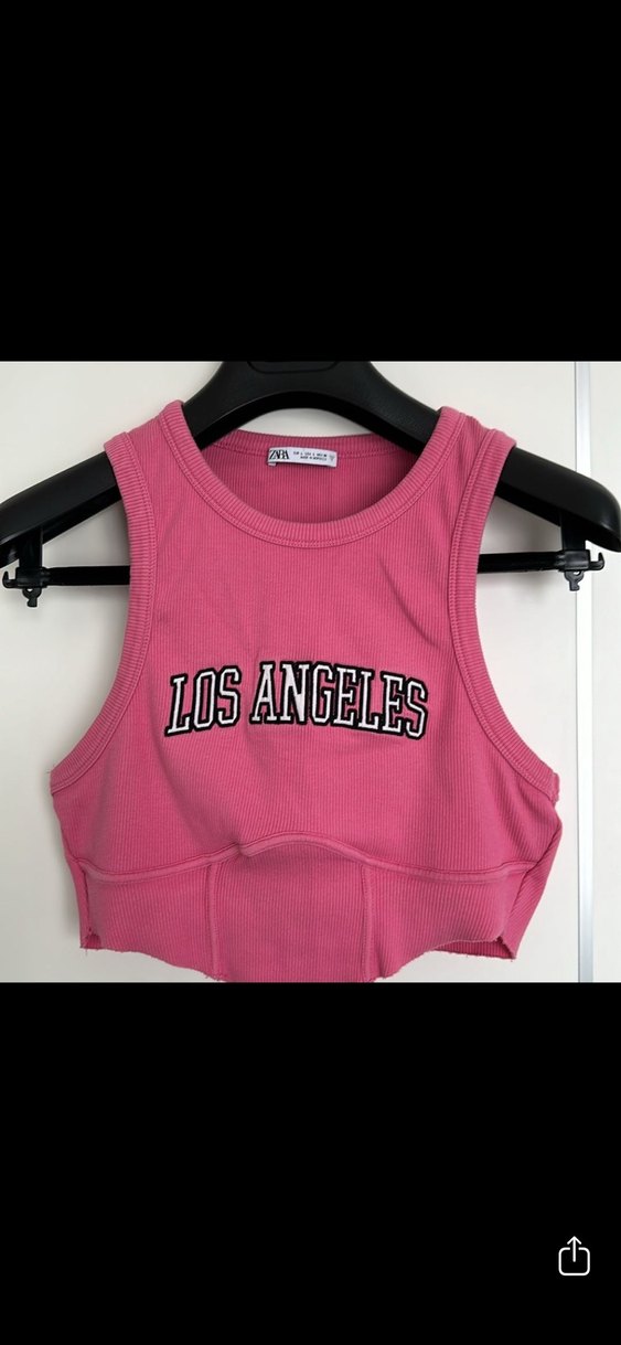 Pembe, kolsuz ve fitted kesim olan bu crop top, önünde 'LOS ANGELES' baskısı ve yuvarlak yakaya sahiptir. Yumuşak pamuk kumaştan üretilmiş, trend sokak stili sunar.