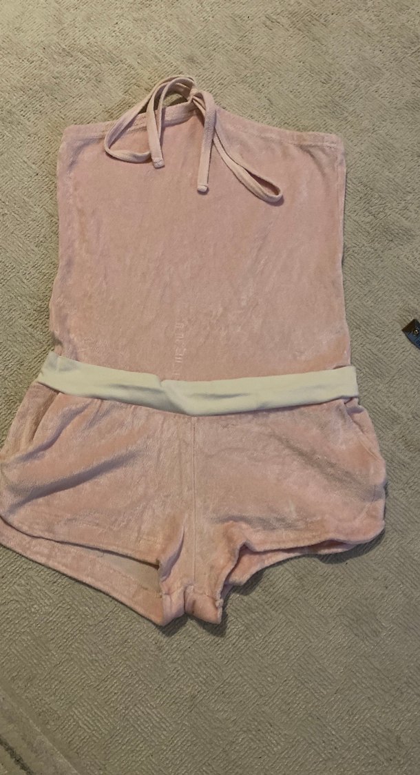 Kolsuz, straplez yakalı, bel kemerli pembe mini tulum, yumuşak ve sıcak dokulu kumaştan, günlük kullanıma uygun.