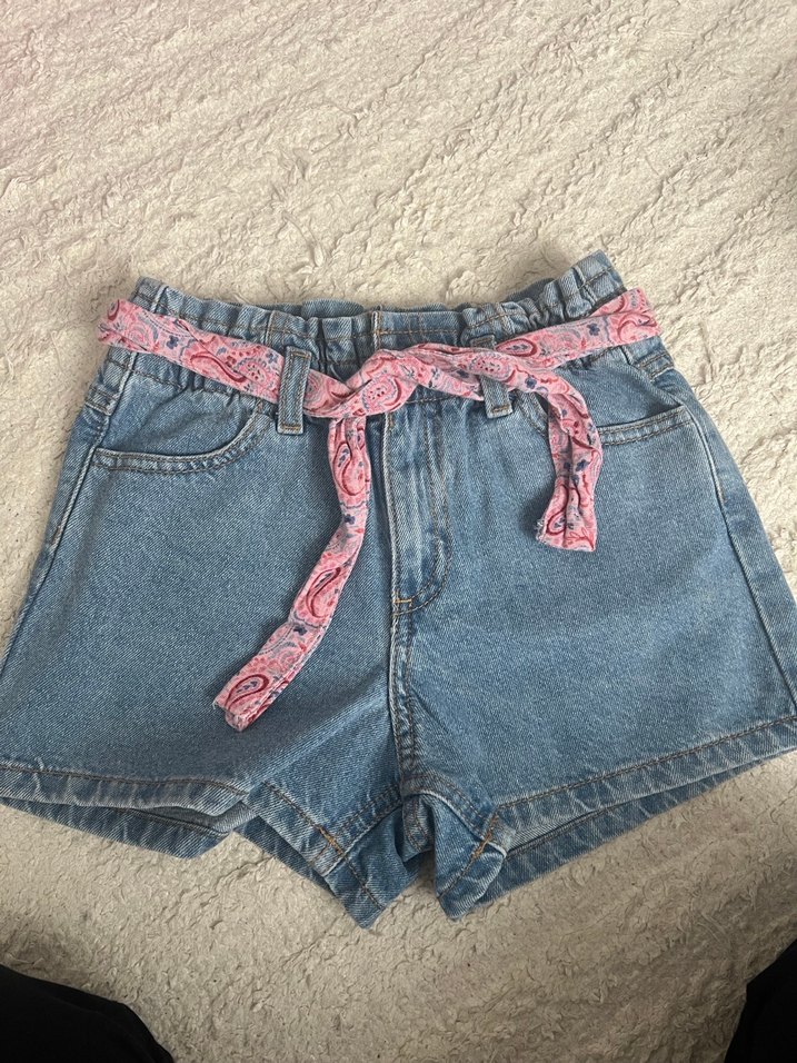 Kadınlar için belden kuşaklı, bol kesim kot şort. Kuşakta pastel pembe tie-dye deseni bulunur. Günlük dış mekan kullanımı için uygundur. Yeni sadece bir kez denendi..