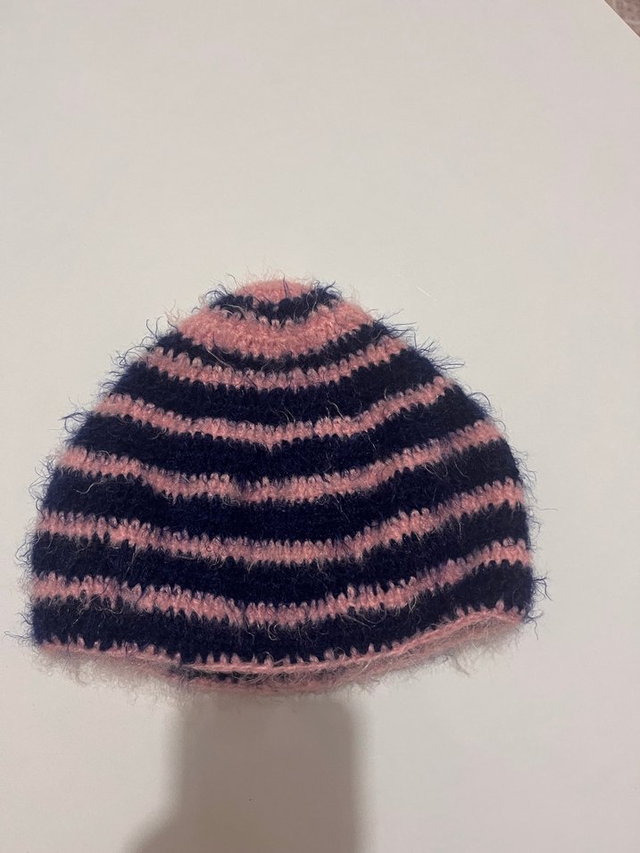 Kadınlar için pembe ve lacivert çizgili örgü bere, yumuşak örgü kumaştan rahat bir his sağlar.