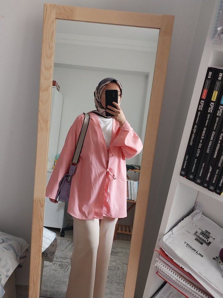 Pembe midi uzunlukta, bol kesim ve yüksek yakalı uzun kollu cekettir. Sentetik kumaştan yapılmış, desen içermeyen, rahat ve şık bir ofis kıyafetidir.