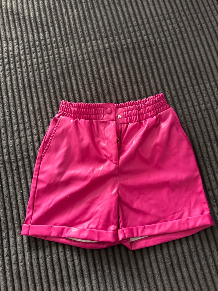 Düğmeli ön kısmı ve canlı pembe rengiyle, sentetik kumaştan üretilmiş, dar kesim kadın mini deri şort. Sokak tarzına uygun, dış mekan kullanımı için ideal.