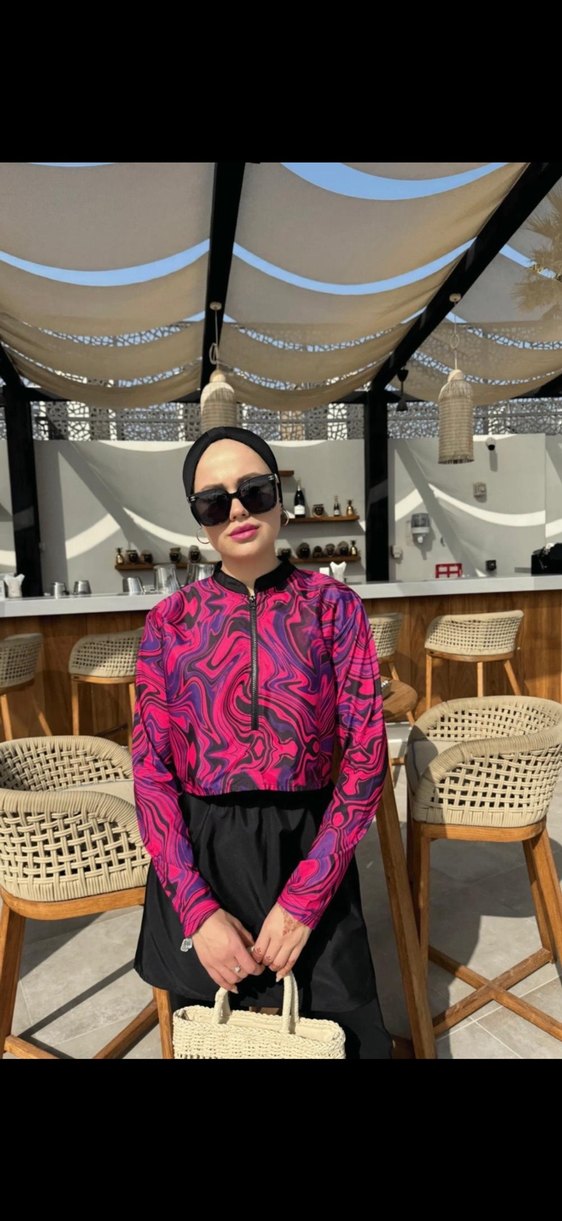 Kadınlar için koyu pembe tie-dye desenli, yüksek yakalı ve uzun kollu mayo. Bol kesim ve mini boy ile günlük kullanıma uygun şık tasarım.