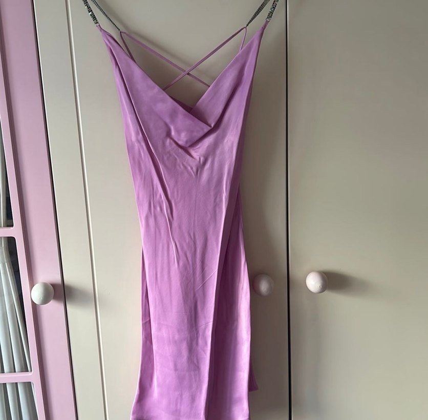 Kadınlar için pastel pembe renkte, saten kumaştan, askılı, drapeli V yaka ve mini, vücuda oturan elbise. Sadece bir kere mezuniyette giydim onun dışında kullanılmadı.
