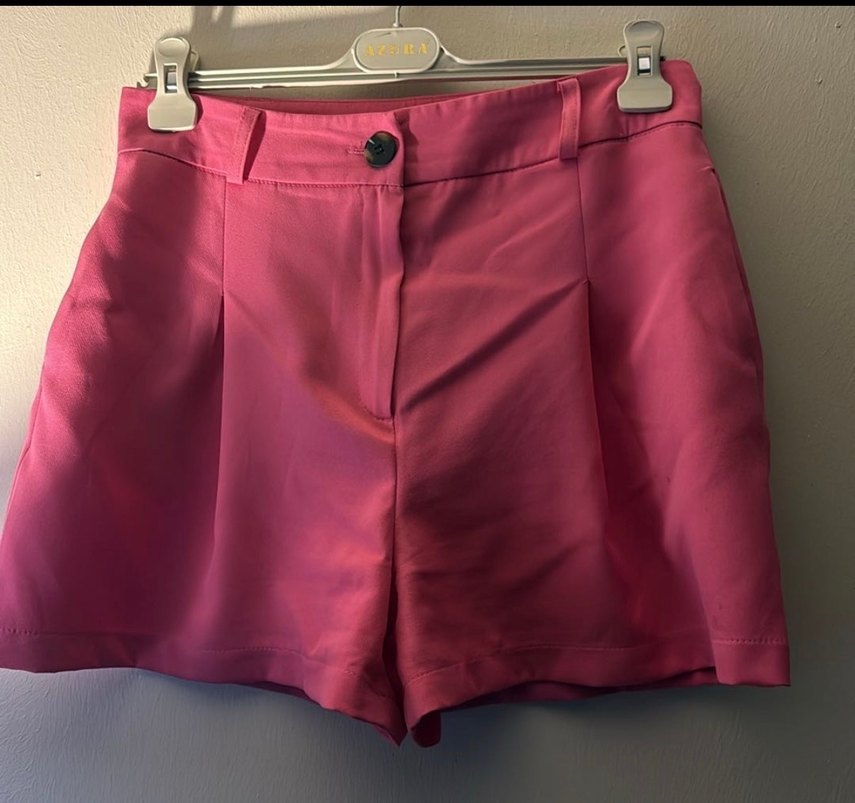Kadın pembe mini yüksek bel şort, parlak ipeksi kumaş, düğmeli ve bol kesim L beden XL uyumlu. Defosuz