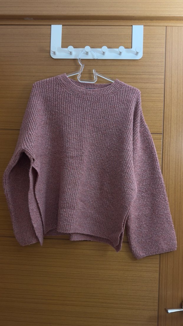 Pembe örgü kazak, bisiklet yaka, uzun kollu ve salaş kesimlidir. Rahat ve pastel tonlarıyla günlük kullanıma uygundur. Yanlarda yırtmaç detayı var Kumaşı çok yumuşak dokulu konforlu