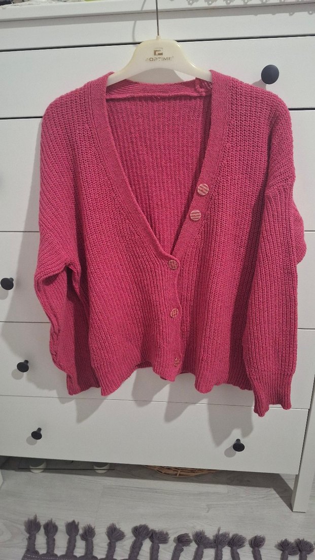Pembe renkli, örgü dokulu, V yaka, uzun kollu ve normal midi uzunlukta, rahat kesim kadın hırka. Desensiz ve günlük kullanıma uygun.