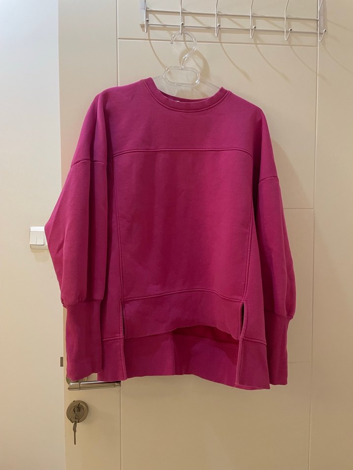 Koyu pembe kadın sweatshirt, yuvarlak yaka, uzun kollu ve oversize kesimdir. Yumuşak ve sıcak kumaştan, normal boyda, alt kısmında küçük yırtmaç detayı bulunur. Günlük kullanıma uygun, rahat ve şık bir tasarım. ✨