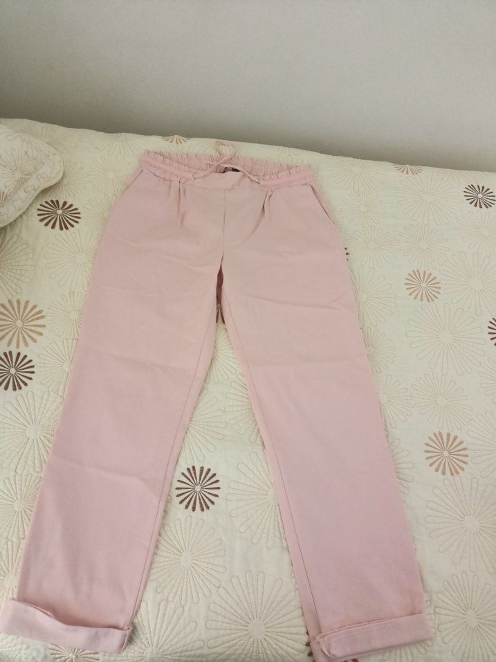 Kadınlar için pastel pembe pamuk pantolon, rahat kesim ve normal boyda, günlük kullanıma uygun zahmetsiz şıklık sunar. Herhangi bir kusuru yok.