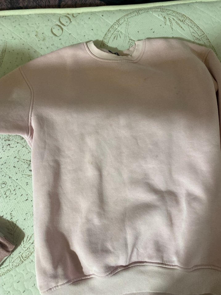 Pembe pamuklu, bisiklet yaka ve uzun kollu, rahat kesimli sweatshirt. Günlük kullanım için sade ve konforlu bir seçimdir.