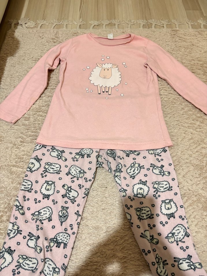 Pembe renkli kadın pijama takımı, uzun kollu ve yuvarlak yakalıdır. Üstünde tek koyun baskısı, altı çoklu koyun desenlidir. Yumuşak ve örgü dokulu kumaştan üretilmiştir.