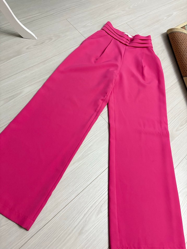 Uzun, pembe kadın pantolonu, pilili ve regular fit kesimde, yumuşak sentetik kumaştan. Minimalist tarzıyla günlük şıklığa uygun.