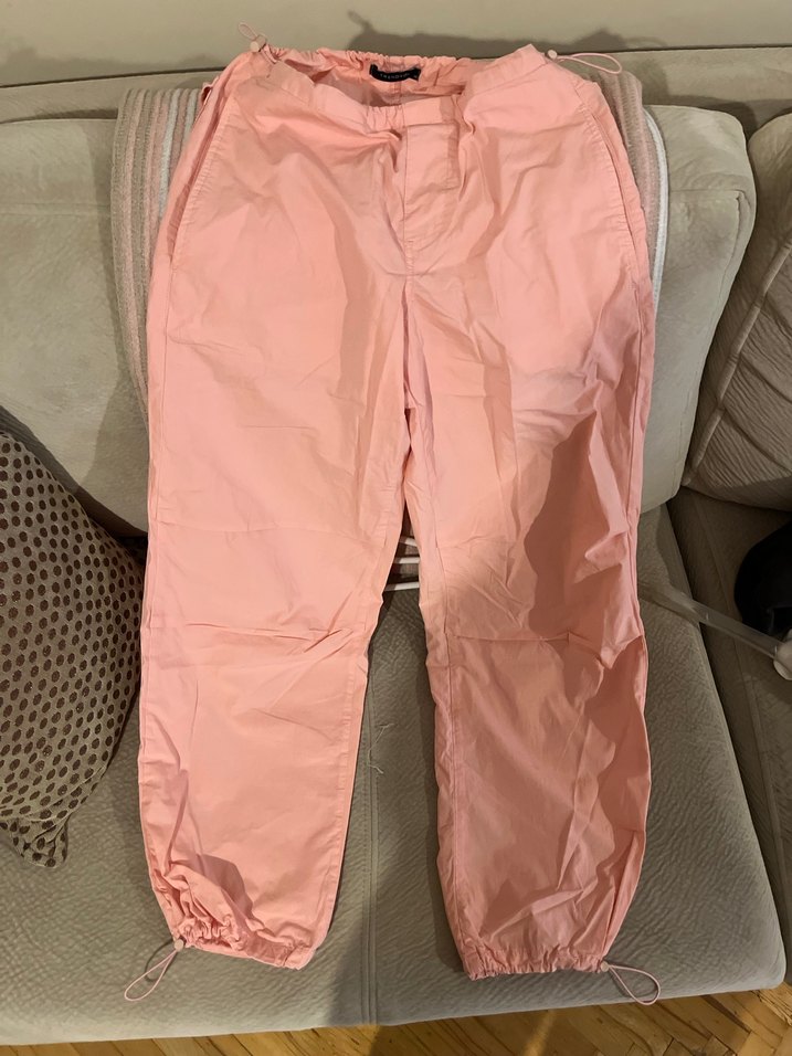 Kadınlar için pembe, rahat kesim paraşüt pantolon. lastikli bel ayarlanabilir ve lastikli paçalar içerir, dış mekan ve günlük sokak stili için uygundur. hiç giyilmedi temizdir.