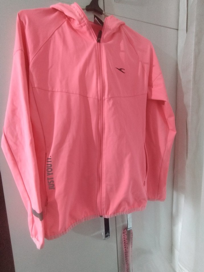 Kadınlar için açık pembe renkli, yüksek yakalı, uzun kollu ve fermuarlı spor ceket. Sentetik kumaştan, bol kesimlidir ve rahat kullanım sunar. Nike marka