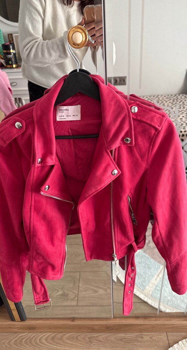 Pembe süet, kısa kesim ve beli kuşaklı bu dar kesim deri ceket, notlu yaka ve askılı kollara sahiptir.