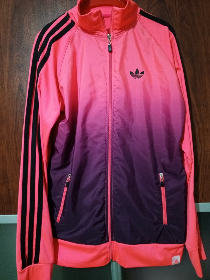 Kadınlar için tasarlanmış, yüksek yakalı ve uzun kollu, fermuarlı spor ceket. Pembe tonlarında tie-dye deseni ve fermuarlı cepler bulunur.