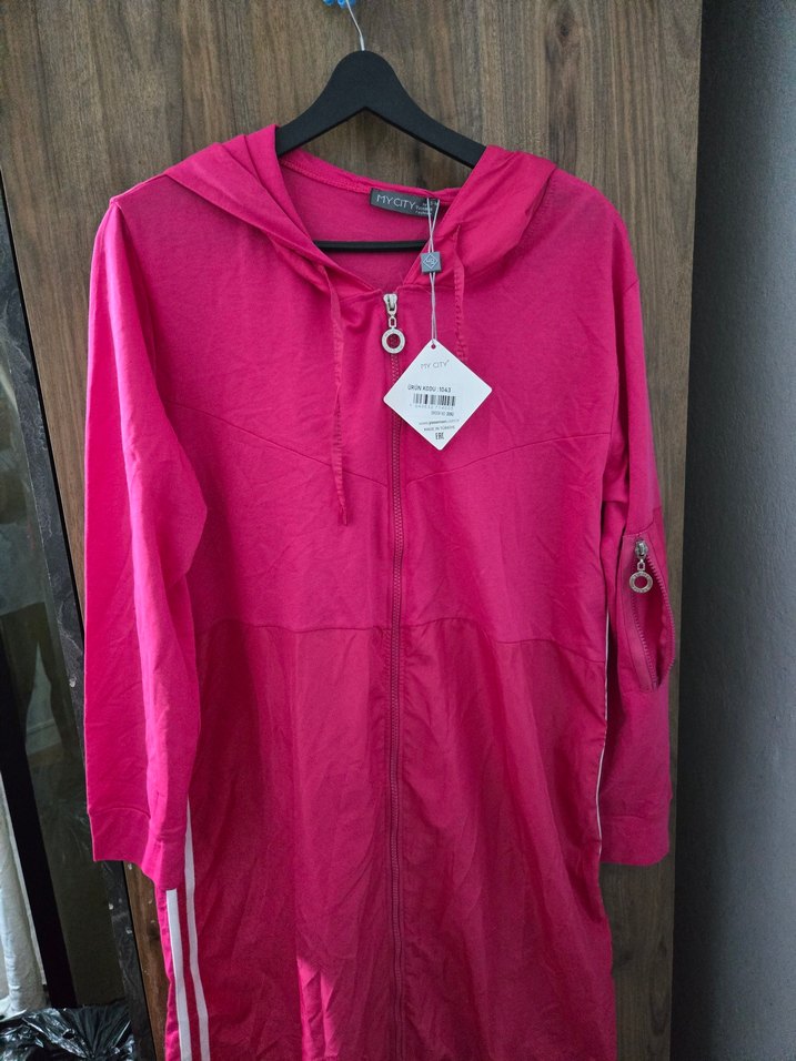 Kadınlar için uzun, bol kesim ve uzun kollu ceket. Yuvarlak yaka ve ön fermuarlı, yumuşak ve sıcak kumaştan. Canlı pembe rengi ve sokak tarzıyla günlük kullanıma uygun.