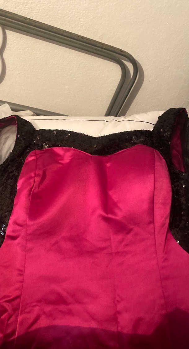 Bu dar kesim kadın abiye elbise, tekne yakalı ve kolsuzdur. Koyu pembe renkte siyah payet detayları vardır ve fermuarlı kapamaya sahiptir, gösterişli parti anları için uygundur.