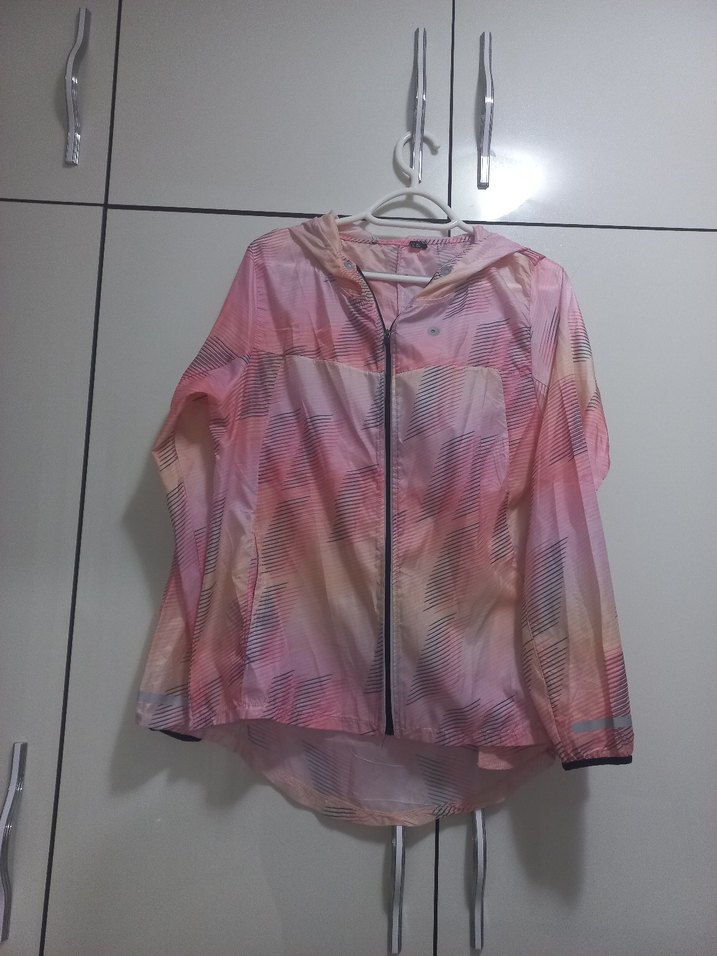 Kadınlar için açık pembe tonlarda, fermuarlı uzun kollu bol kesim yağmurluk. Sokak modasına uygun rahat bir tasarım.