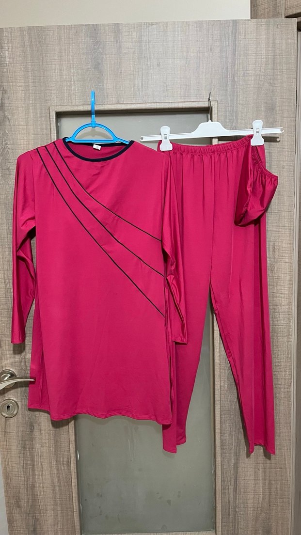 Kadınlar için pembe renkte, uzun kollu ve bol kesim tesettür mayo. Üst kısmında çağdaş athleisure tarzda ince çapraz çizgiler bulunur.