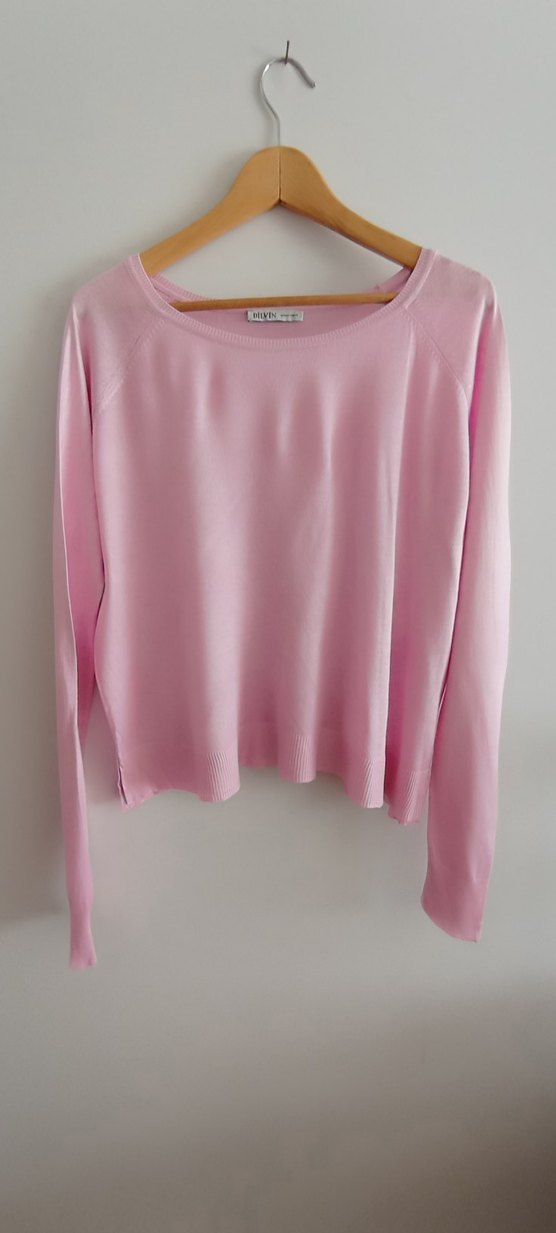 Kadınlar için yuvarlak yaka ve uzun kollu, pastel pembe renginde, hafif parlak ve yumuşak dokulu, sade ve rahat kesime sahip kazak.