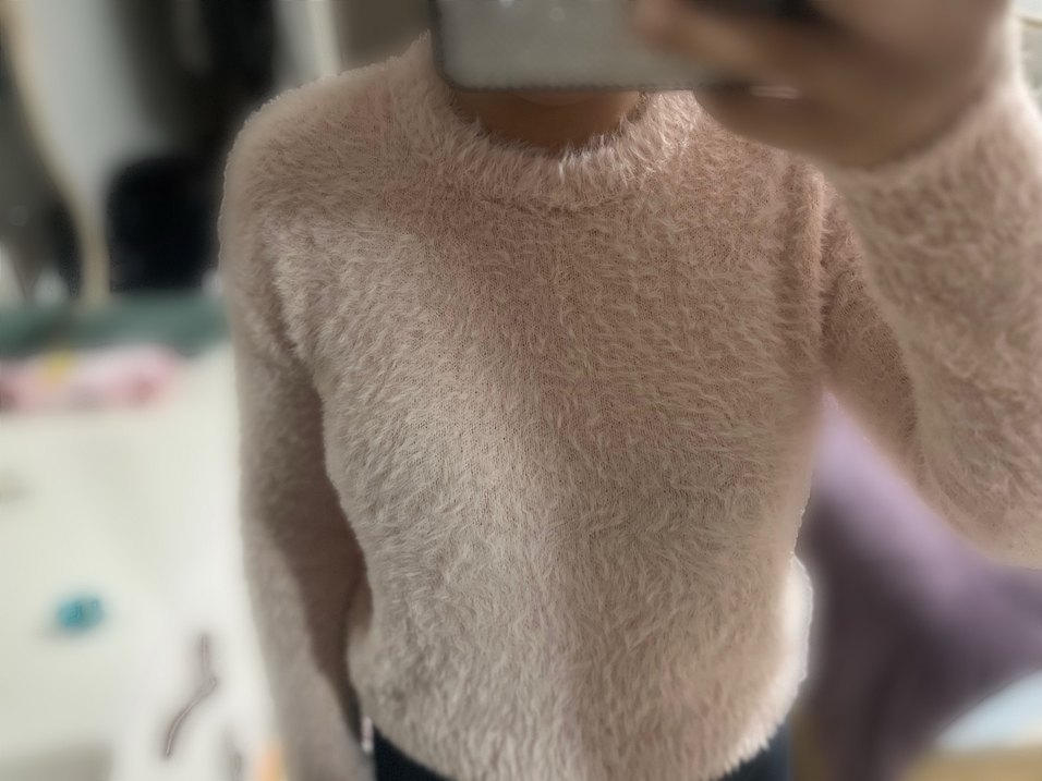 pembe renk, tüylü detaylı yünlü triko. Yuvarlak yaka, uzun kollu ve vücuda oturan normal boy kesime sahip. Rahat ve şık bir görünüm sunar. geniş kalıptır