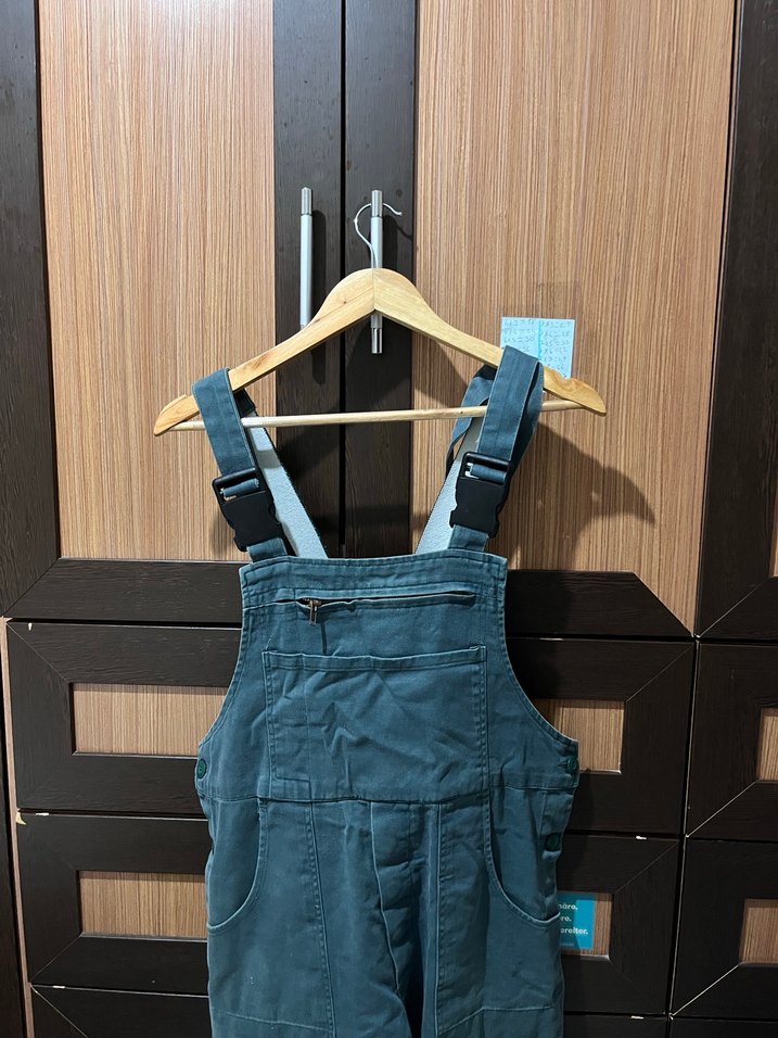 Askılı, tokalı mavi denim uzun tulum. Yüksek yakalı, cep detaylı, rahat ve şık dış mekan kullanımı için uygundur.