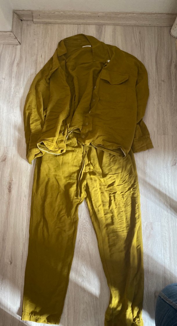 Erkekler için koyu sarı renkte, düğmeli ve yakası açık uzun kollu, normal midi boyda rahat kesim pijama takımı.
