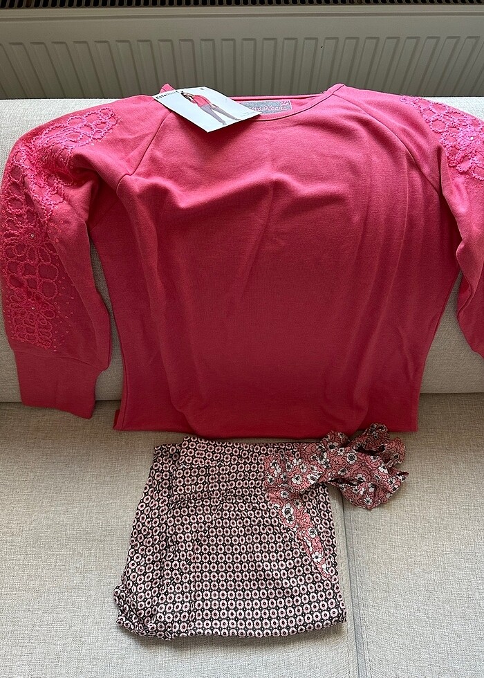 Etiketli. Evde giyilebilecek günlük takım. Kumaş kalitesi çok güzel. Üst pamuk, alt viskon. Cepli. S-M bedene uygun