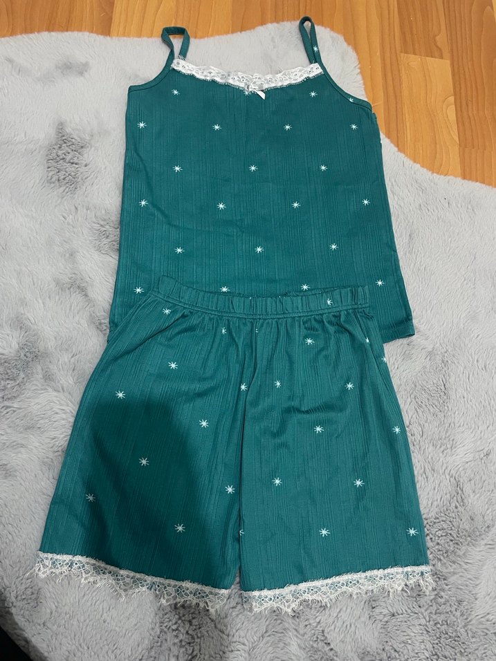 Koyu turkuaz renkte, nakışlı ve dantel detaylı, kısa kollu ve mini boy kadın pijama takımı, rahat ve bohem tarzda.