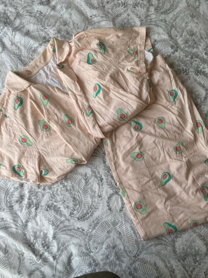 kısa kollu, avokado desenli, bol kesim uzun bej kadın pijama takımı.