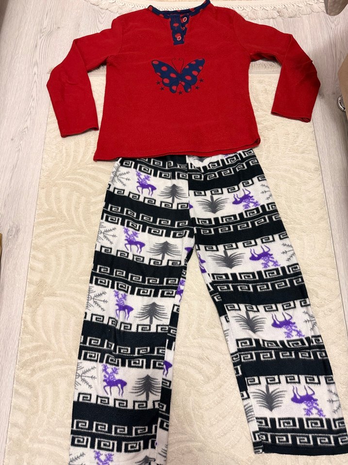 Polar Kırmızı uzun kollu, V yaka üst , beyaz, mor desenli uzun pantolonlu bol kesim kadın pijama takımı. Ürünler temiz kullanılmıştır yırttığı ve deformesi yoktur.