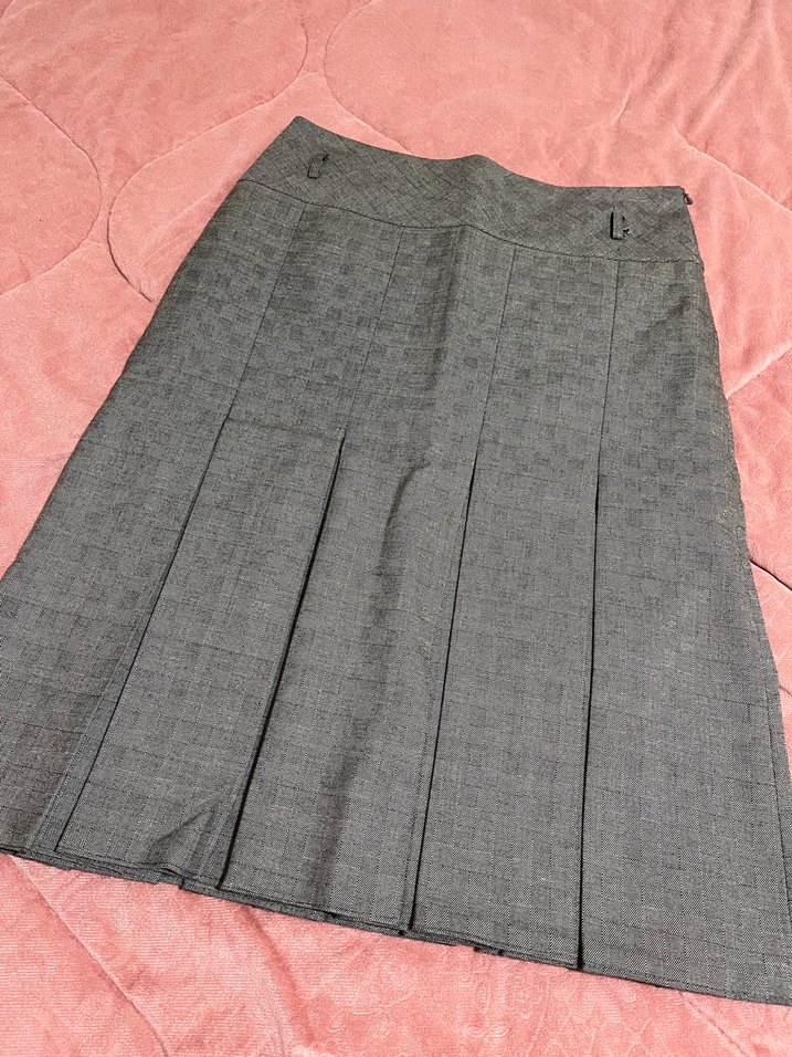 Kadın pileli gri etek, astarlıdır. Yandan fermuarı mevcuttur