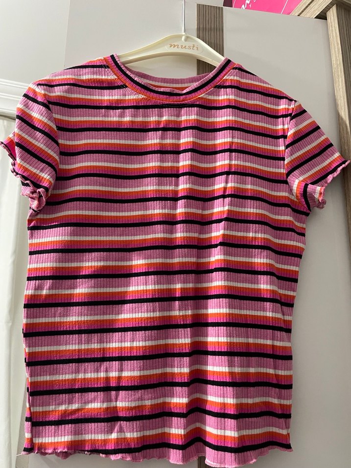 Pileli detaylı, kısa kollu, yuvarlak yakalı, pastel pembe çizgili kız çocuk tişörtü, trend sokak stili sunar.