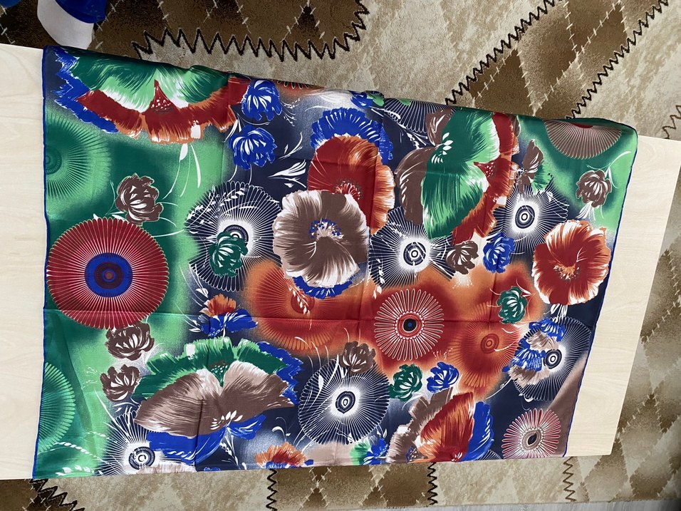 Kadınlar için pilili, koyu zemin üzerinde çok renkli çiçek desenli, sentetik kumaştan yapılmış şal.