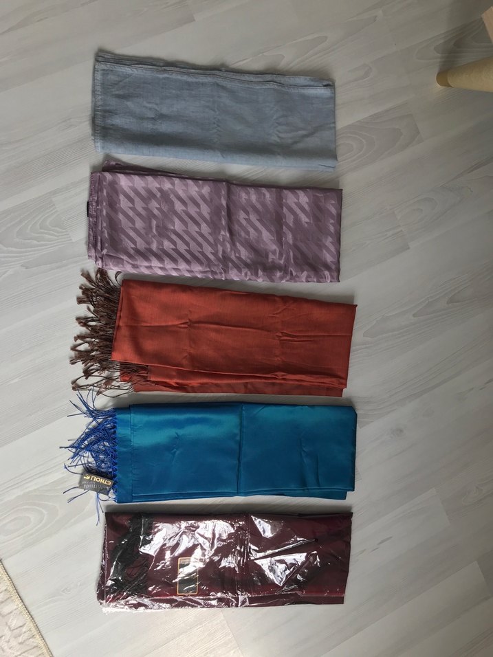Kadınlar için pilili tasarıma sahip, saten kumaştan yapılmış, koyu ve çok renkli tonlarda bohem tarzda şal. Mütevazı ve rahat bir görünüm sunar. 1 i jakar 3 ü tafta birisi spor kumaştır 2 si hiç kullanılmamış etiketlidir kırmızı ve koyu mavi hiç kullanılmamıştır digerleri bir kaç kere kullanılmıştır kullanıma bağlı minik lekeler olabilir hepsi birlikte fiyattır