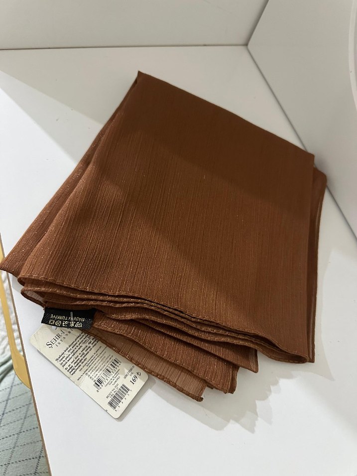 Kadın pilili kahverengi şal, yumuşak sentetik kumaştan yapılmıştır ve minimalist, bohem tarzıyla uyumludur.