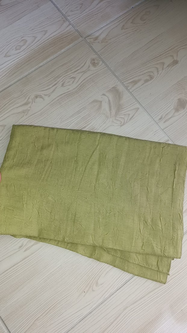 Kadınlar için keten kumaştan, pilili tasarıma sahip, yumuşak haki renkte şal. Minimalist ve bohem tarzda, sade ve temel görünümlü.
