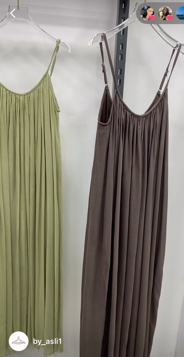 Keten kumaştan, pilili ve askılı uzun elbise. Straplez yaka ve bol kesim, bohem tarz için uygundur. Hakive kahverengi renk seçenekleriyle.